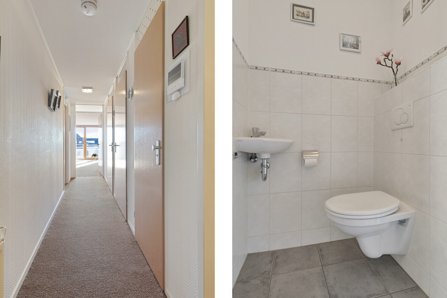 Via de nette centrale entree met videofooninstallatie, brievenbussen en toegang tot zowel het trappenhuis als de lift bereik je het appartement op de bovenste verdieping van het complex. Binnenkomst is in de hal, die toegang geeft tot de verschillende vertrekken van de woning.