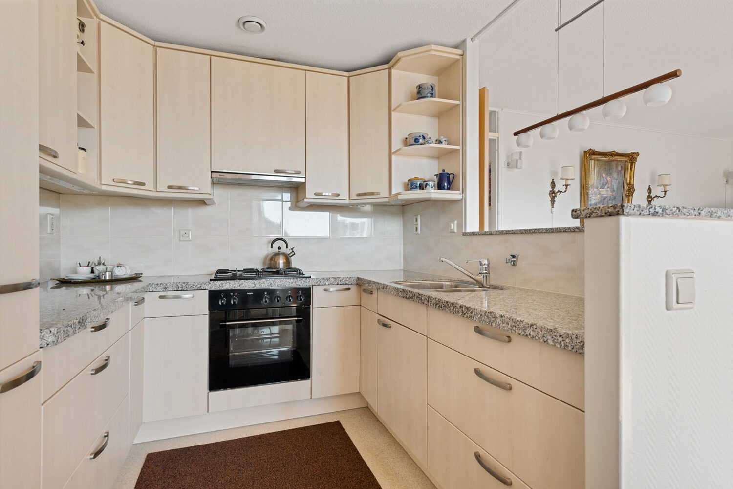 Via een schuifdeur bereik je vanuit de woonkamer het balkon. Dit balkon is gelegen op het zuidoosten, waardoor je hier een groot deel van de dag kunt genieten van de zon. Het is een fijne plek voor een gezellige zitplek waar je rustig kunt ontspannen, een kop koffie kunt drinken of aan het einde van de dag nog even buiten kunt zitten terwijl je uitkijkt over het plein. De open keuken sluit mooi aan op de woonkamer en biedt voldoende ruimte om uitgebreid te koken terwijl je in contact blijft met de leefruimte.